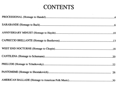 Musical Reflections (Later Elementary) $5.95 – $19.95 X Musical Reflections Later Elementary (Complete) – $19.95 Processional (Homage to Handel) – $5.95 Sarabande (Homage to Bach) – $5.95 Anniversary Minuet (Homage to Haydn)Â – $5.95 Capriccio Brilliante (Homage to Beethoven) – $5.95 West End Nocturne (Homage to Chopin) – $5.95 Cantilena (Homage to Schumann) – $5.95 Prelude (Homage to Tchaikovsky) – $5.95 Pantomime (Homage to Shostakovich) – $5.95 American Ballade (Homage to American Folk Music) – $5.95 Purchase Checkout Added to cart