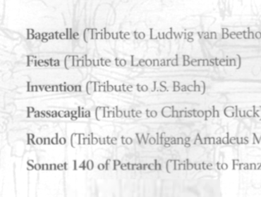 Tribute to the Masters (Intermediate) $5.95 – $15.95 X Tribute to the Masters Intermediate (Complete) – $15.95 Invention (Tribute to J.S. Bach) – $5.95 Passacaglia (Tribute to Christoph Gluck) – $5.95 Rondo (Tribute to Wolfgang Amadeus Mozart) – $5.95 Bagatelle (Tribute to Ludwig van Beethoven) – $6.95 Fiesta (Tribute to Leonard Bernstein) – $5.95 Sonnet 140 of Petrarch (Tribute to Franz Liszt) – $5.95 Purchase Checkout Added to cart