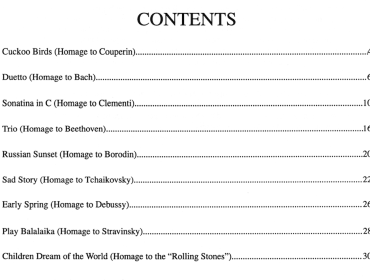 Musical Reflections (Mid-Elementary) $5.95 – $19.95 X Musical Reflections Mid-Elementary (Complete) – $19.95 Cuckoo Birds (Homage to Couperin) – $5.95 Duetto (Homage to Bach) – $5.95 Sonatina in C (Homage to Clementi) – $5.95 Trio (Homage to Beethoven) – $5.95 Russian Sunset (Homage to Borodin) – $5.95 Sad Story (Homage to Tchaikovsky) – $5.95 Early Spring (Homage to Debussy) – $5.95 Play Balalaika (Homage to Stravinsky) – $5.95 Children Dream of the World (Homage to the "Rolling Stones") – $5.95 Purchase Checkout Added to cart