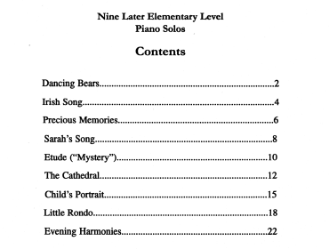 Musical Gallery (Later Elementary) $5.95 – $19.95 X Musical Gallery Mid-Elementary (Complete) – $19.95 Dancing Bears – $5.95 Irish Song – $5.95 The Cathedral – $6.95 Precious Memories – $5.95 Sarah's Song – $6.95 Etude ("Mystery") – $5.95 Child's Portrait – $6.95 Rumanian Dance – $5.95 Procession of Dinosaurs – $6.95 Space Fantasy – $6.95 Purchase Checkout Added to cart