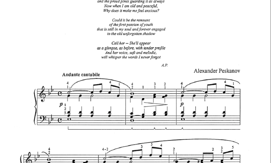 Peskanov’s Meditation was composed in a living room of his friends, Lynn and Jean Radcliffe. The inspiration came from Lynn’s painting that was hanging on the wall just opposite of the grand piano. Peskanov has written a poetry that is included in copy of this music. The Lynn’s painting is on the cover as well. Meditation is driven by beautiful harmonic suspensions. The nostalgic theme serves almost as obligato part over the slowly moving chord progression.