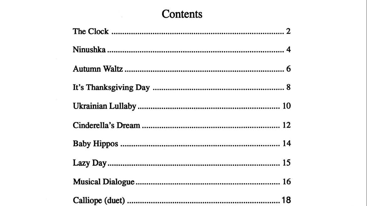 • Calliope (4 Hands) • Ninushka • The Clock • It’s Thanksgiving Day • Ukrainian Lullaby • Cinderella’s Dream • Baby Hippos • Lazy Day • Musical Dialogue • Autumn Waltz