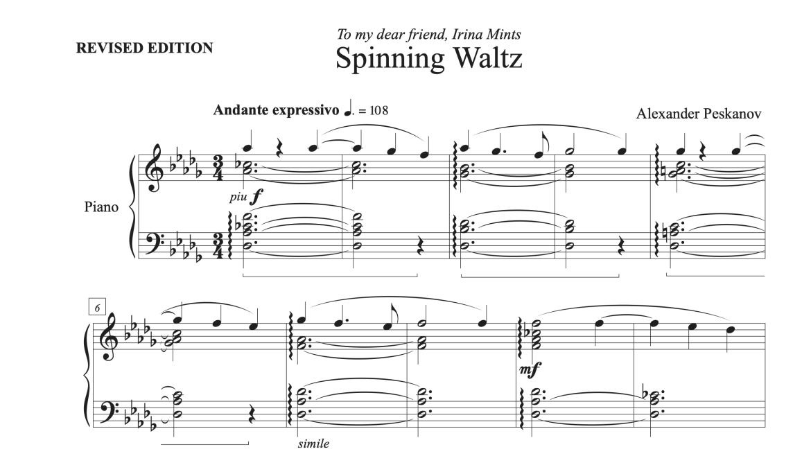 Alexander Peskanov’s Spinning Waltz (Advanced) is an engaging upbeat tune. It is filled with youthful energy, catchy themes, elegance and abundance of virtuosity. It is an excellent choice for a senior recital! Spinning Waltz is published by Classical Video Concepts, Inc.