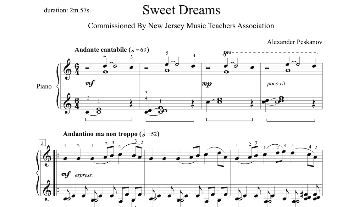 As the 2014 NJMTA Commissioned Composer, Alexander Peskanov has written four wonderful compositions such as West Orange Bourrée, Sweet Dreams, Waltz-Scherzo and Irish Poem. This piece was inspired by Tchaikovsky’s Sweet Dreams that Peskanov played as a young student. It’s filled with lyricism and poetry.